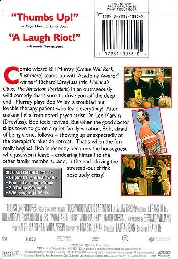 Before going on vacation, self-involved psychiatrist Dr. Leo Marvin has the misfortune of taking on a new patient: Bob Wiley. An exemplar of neediness and a compendium of phobias, Bob follows Marvin to his family's country house. Dr. Marvin tries to get him to leave; the trouble is, everyone loves Bob. As his oblivious patient makes himself at home, Dr. Marvin loses his professional composure and, before long, may be ready for the loony bin himself.