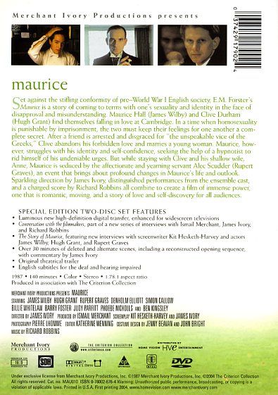 A Cambridge-i egyetemre jár az Edward-korabeli Angliában Clive, a gazdag arisztokrata fiú és barátja, Maurice. A két ifjú egyre közelebb kerül egymáshoz, a barátságból szerelem lesz. Az iskola befejezése után azonban útjaik elválnak. Clive "megtér", és a politikai karrierje érdekében megtagadja homoszexuális szerelmét, és hamarosan megházasodik. Maurice viszont egy másik ifjú, Alec személyében találja meg az igazi szenvedélyes szerelmet. E.M. Forster önéletrajzi ihletésű regényéből. A könyv 1971-ig tiltott listán szerepelt.