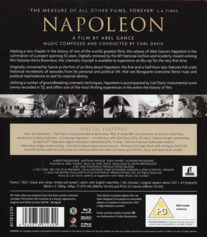 A massive 5 1/2 hour biopic of Napoleon, tracing his career from his schooldays (where a snowball fight is staged like a military campaign), his flight from Corsica, through the French Revolution (where a real storm is intercut with a political storm) and the Terror, culminating in his triumphant invasion of Italy in 1797 (the film stops there because it was intended to be part one of six, but director Abel Gance never raised the money to make the other five). The film's legendary reputation is due to the astonishing range of techniques that Gance uses to tell his story, culminating in the final twenty-minute triptych sequence, which alternates widescreen panoramas with complex multiple- image montages projected simultaneously on three screens.