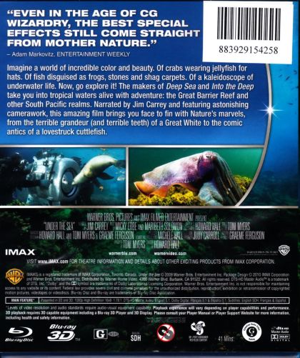 Imagine a world of incredible color and beauty. Of crabs wearing jellyfish for hats. Of fish disguised as frogs, stones and shag carpets. Of a kaleidoscope of life dancing and weaving, floating and darting in an underwater wonderland. Now, go explore it! Howard Hall and his filmmaking team, who brought you Deep Sea and Into the Deep, take you into tropical waters alive with adventure: the Great Barrier Reef and other South Pacific realms. Narrated by Jim Carrey and featuring astonishing camerawork, this amazing film brings you face to fin with Nature's marvels, from the terrible grandeur (and terrible teeth) of a Great White to the comic antics of a lovestruck cuttlefish. Excitement and fun run deep Under the Sea!