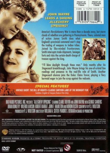 Allegheny Uprising is a 1939 film produced by RKO Pictures, starring Claire Trevor and John Wayne as pioneers of early American expansion in south central Pennsylvania. Clad in buckskin and a coonskin cap (as he would be a decade later in The Fighting Kentuckian), Wayne plays real-life James Smith, an American coping with British rule in colonial America. The film is loosely based on a historical event known as the Black Boys Rebellion during the 1760s.