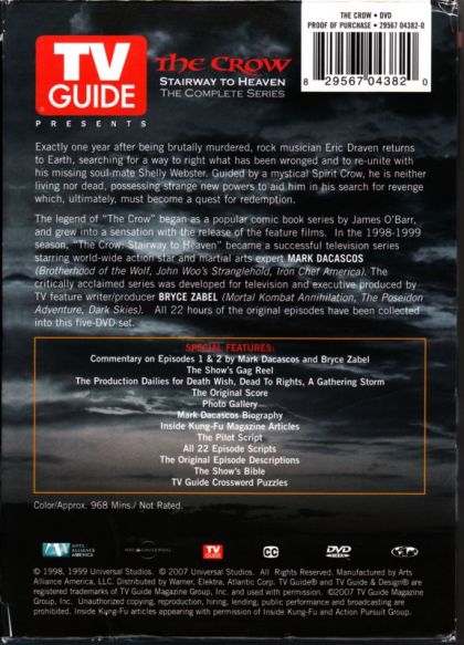 Exactly one year after his death, rock musician Eric Draven returns to earth in a symbolic and literal leap from the bridge that joins the Land of the Dead and the land of the living. Possessing the mystic powers of The Crow, he is neither living nor dead, searching for a way to right what has been wronged. The Crow: Stairway to Heaven continues the legacy of Eric Draven and expands on the mythology of the successful feature film franchise. Joined as soulmates, Draven and his girlfriend Shelly were inseparable ” until they were brutally and senselessly murdered. Now their souls cannot rest. Their romance endures time and death, creating an incredible longing between the young lovers. Draven seeks redemption by helping others, fighting for those who cannot fight for themselves. Through each act of justice, he is taken one step closer to his own salvation. A foot soldier on the side of good, at Draven's core is a powerful force that transforms him into The Crow ” his alter