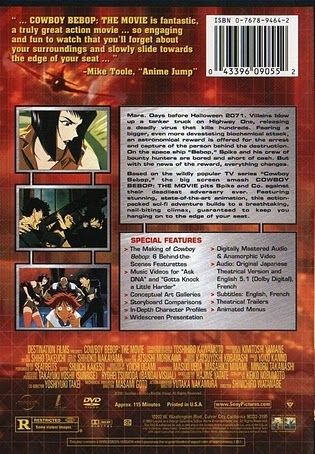 The year is 2071. Following a terrorist bombing, a deadly virus is released on the populace of Mars and the government has issued the largest bounty in history, for the capture of whoever is behind it. The bounty hunter crew of the spaceship Bebop; Spike, Faye, Jet and Ed, take the case with hopes of cashing in the bounty. However, the mystery surrounding the man responsible, Vincent, goes deeper than they ever imagined, and they aren't the only ones hunting him.