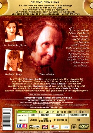 Tatie Danielle is a black comedy about a widow who is intent on ruining the lives of her great-nephew and his wife. Tsilla Chelton plays the title character, who mourns the death of her husband by tormenting everyone she meets. Eventually, she moves in with her nephew and his vain wife. Soon, her family is at war with Tatie, and takes off for Greece, leaving her in the care of Sandrine (Isabelle Nanty), an au pair who is as equally bitter as Tatie herself. At first the two don't get along, yet the two eventually become friends. However, Sandrine is invited to accompany an American student for an overnight stay at the beach, which would leave Tatie alone for a night. Angered, Tatie fires Sandrine, and while she is alone, she goes into deep depression, eventually setting the family's apartment on fire. The fire becomes a national story, with Tatie cast as a poor old lady and the family labeled as cruel and heartless villains.