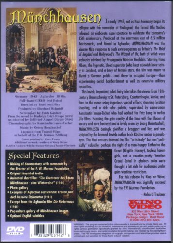 Münchhausen is a 1943 fantasy comedy film directed by Josef von Báky, a prominent director who remained in Germany under the Nazi regime. Despite being made in Nazi Germany, this film is noted for the way in which it was able to avoid the politics of the time. Science fiction author David Wingrove has commented that this work “sidesteps immediate political issues whilst conjuring up marvellous visual images of an ageless pastoral Germany.”The story follows the life of Baron Hieronymus von Münchhausen who was granted immortality by a sorcerer some 200 years previously. Here he recounts to a group of friends tales of his travels through Russia, his encounter with a man who could run more than 200 miles per hour, and a ring he was given which would make him invisible. His story culminates in his recounting a trip to the Moon where he meets bodyless plant people.