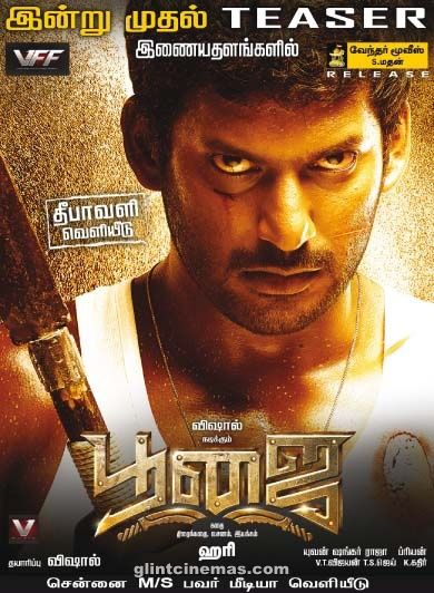 Poojai is a 2014 Tamil action-masala film directed by Hari and produced by Vishal, who himself plays the lead role alongside an ensemble cast featuring Shruti Haasan, Sathyaraj, Raadhika Sarathkumar and Mukesh Tiwari.