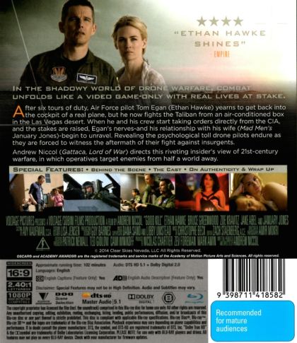In the shadowy world of drone warfare, combat unfolds like a video game–only with real lives at stake. After six tours of duty, Air Force pilot Tom Egan now fights the Taliban from an air-conditioned bunker in the Nevada desert. But as he yearns to get back in the cockpit of a real plane and becomes increasingly troubled by the collateral damage he causes each time he pushes a button, Egan’s nerves—and his relationship with his wife—begin to unravel.