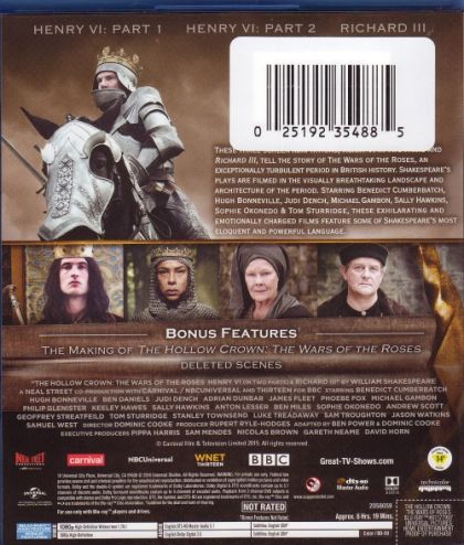 These three screen adaptations, Henry VI in two parts and Richard III, tell the story of “The War of the Roses”, an exceptionally turbulent period in British history. Shakespeare’s plays are filmed in the visually breathtaking landscape and architecture of the period. Starring Benedict Cumberbatch, Hugh Bonneville, Judi Dench, Michael Gambon, Sally Hawkins, Sophie Okonedo & Tom Sturridge, these exhilarating and emotionally charged films feature some of Shakespeare’s most eloquent and powerful language