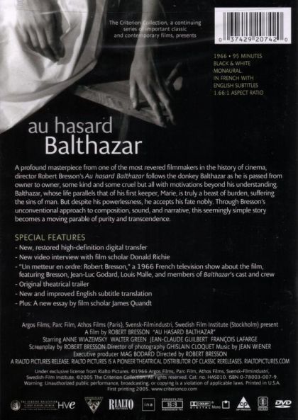 Bár a címszereplő Balthazár egy szamár, nem ezópuszi tanmesét és nem is kalandos állattörténetet látunk. Bresson szavaival: „A szamár ugyanazokat a szakaszokat éli át, mint egy ember: gyermekkorában a becézgetést, érett korában a munkát, a tálentumot az élet feleútján, s a végső misztikát, mely a halált közvetlenül megelőzi. A szamár hordozza a relikviákat, s meghal aztán, mert az emberek bűneit hordozza.” A szamár mellett, mely különféle bűnöket – gőgöt, iszákosságot, lustaságot, durvaságot, pénzvágyat, a kiszolgáltatottak megalázását – megtestesítő emberekkel találkozik, a film másik hőse Marie, aki szintén védtelen és vétlen teremtés. Kettőjük sorsa párhuzamos, mindketten áldozatok.