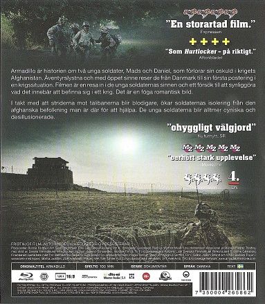 ARMADILLO is an upfront account of growing cynicism and adrenaline addiction for young soldiers at war. Mads and Daniel are on their first mission in Helmand, Afghanistan. Their platoon is stationed in Camp Armadillo, right on the Helmand frontline, fighting tough battles against the Taliban. The soldiers are there to help the Afghan people, but as fighting gets tougher and operations increasingly hairy, Mads, Daniel and their friends become cynical, widening the gap between themselves and the Afghan civilisation. Mistrust and paranoia set in causing alienation and disillusion. Armadillo is a journey into the soldier’s mind and a unique film on the mythological story of man and war, staged in its contemporary version in Afghanistan.