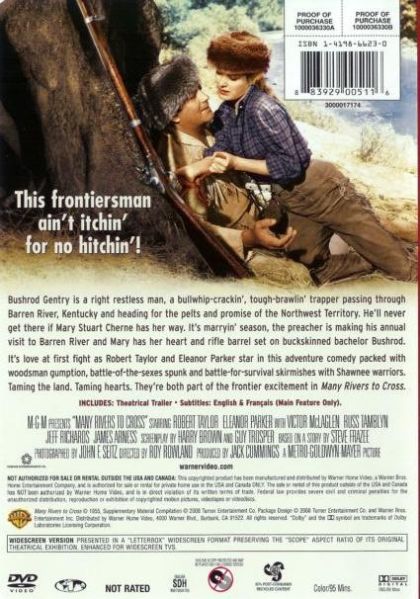 Packaged and sold as an outdoor actioner, Many Rivers to Cross is as much a comedy as anything else. Robert Taylor stars as 18th century trapper Bushrod Gentry, who is himself entrapped into marriage by the spunky Mary Stuart Cherne (Eleanor Parker). Escaping his marital responsibilities (which were impressed upon him on threat of death), Gentry heads into the North Country, with Mary in hot pursuit. Hero and heroine spend the rest of the picture taking turns rescuing each other from hostile Indians. Some of the humor is predicated upon the wholesale slaughter of the "redskins", and as such is a bit hard to take when seen today. Supporting Taylor and Parker are Victor McLaglen as the heroine's burly father, and TV-stars-to be James Arness (Gunsmoke) and Russell Johnson and Alan Hale Jr. (Gilligan's Island).