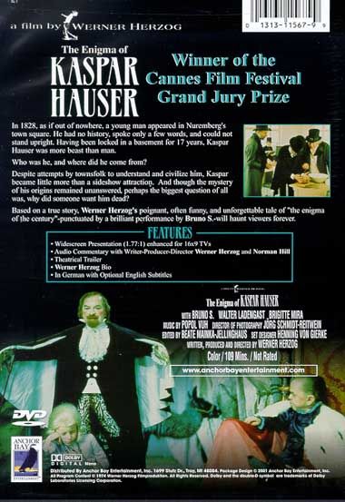 The film follows Kaspar Hauser (Bruno S.), who lived the first seventeen years of his life chained in a tiny cellar with only a toy horse to occupy his time, devoid of all human contact except for a man who wears a black overcoat and top hat who feeds him.