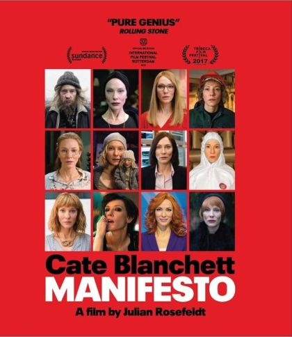 A Manifesto című filmet egy múzeumi videóinstalláció 13 felvételéből állította össze a rendező, Julian Rosefeldt. A film a futurista, dadaista, szuprematista mozgalmak, a Dogma, valamint egyéb művészeti csoportok manifesztumait tolmácsolja Cate Blanchett rendkívüli alakításában. A színésznő 13 különböző személyiséggé változik a kollázsként szerkesztett alkotásban: tanítónő, családanya, hajléktalan férfi, gyári munkás, televíziós hírolvasó – minden egyes szerepében váratlan és meghökkentő kontextusban ad új és drámai értelmet a jól ismert, híres szövegeknek