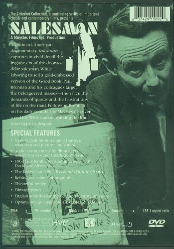 This documentary from Albert and David Maysles follows the bitter rivalry of four door-to-door salesmen working for the Mid-American Bible Company: Paul "The Badger" Brennan, Charles "The Gipper" McDevitt, James "The Rabbit" Baker and Raymond "The Bull" Martos. Times are tough for this hard-living quartet, who spend their days traveling through small-town America, trying their best to peddle gold-leaf Bibles to an apathetic crowd of lower-middle-class housewives and elderly couples.