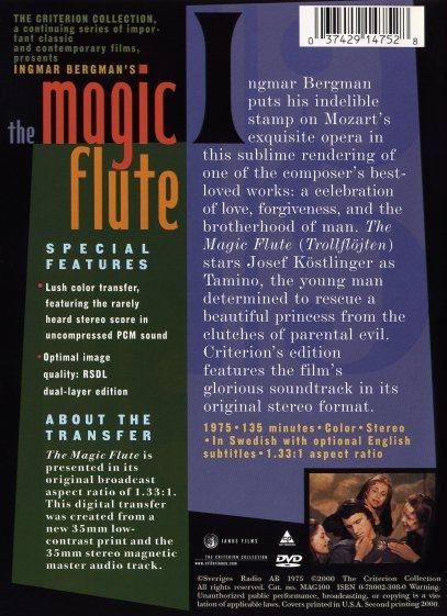 Az Oscar-díjra jelölt televíziós operafilm, Mozart remekművének Bergman-variációja jóval több, mint egy színpadi rendezés egyszerű filmre vitele. Pedig a színház a maga fizikai valóságában jelen van, vasárnapi előadást látunk, a nézőtéren szülők és főleg gyerekek. Miközben Mozart csodálatos, mára emblematikussá emelkedett zenéje vall sötétség és fény harcáról, mi gyakran egy kislány figyelmes, néhol félő, néhol reménykedő arcát látjuk. Általa és érte izgulunk megint, sokadszor, hogy jó legyen a vége. Mozart zenéje és A varázsfuvola alapgondolata a Bergman-Nykvist alkotópáros olvasatában tisztán, meggyőzően szól a 21. század emberéhez is.