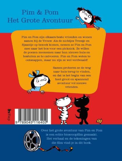 Egy fekete cica és egy fehér cica. Nini, ott kukucskálnak a bicikli kosarában! Pim és Pom legjobb barátok, és együtt laknak a Kedves Hölgynél. Ám amikor a Hölgy unokahúgai elviszik őket piknikezni, megszöknek és eltévednek. Szeretnének hazatalálni, de út közben gyanús alakokkal hozza össze őket a sors. Vajon kiállja-e a barátságuk a próbatételt? Ez aztán a nagy kaland!Édes és tanulságos cicás mese Hollandia legnevesebb rajzolójától!