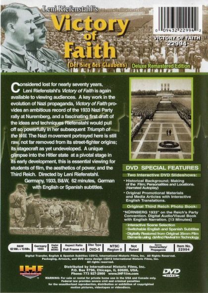 Der Sieg des Glaubens is the first documentary film directed by Leni Riefenstahl, who was hired despite opposition from Nazi officials that resented employing a woman — and a non-Party member too. Her film recounts the Fifth Party Rally of the Nazi Party, which occurred in Nuremberg from 30th August to 3rd September 1933.