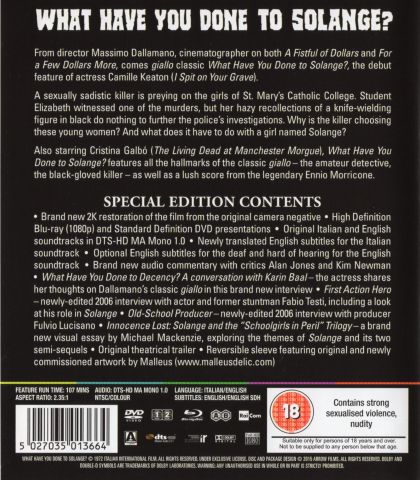A What Have You Done To Solange talpig feketébe öltözött, késes, szótlan sorozatgyilkosa abszolút tipikus figurája a giallo mészárosainak, ám maga a film szinte minden más szempontból a műfaj atipikus darabja. A gyilkosságok egy vízbefojtást leszámítva képen kívül történnek, a kamera csak az eredményüket, a brutális véget ért, vérbe fagyott holttesteket mutatja meg explicite, a látványra reagáló arcok kiemelésével (ld. az apát, miután saját szemével látta, pontosan milyen bestiális módon – óriási kés tövig felszúrva oda – ölték meg a lányát) pedig végképp eltolja a horrort az ölés zsigeri látványosságától az erőszakos halál tudatának lélekben, fejben nehezen feldolgozható borzalmáig.