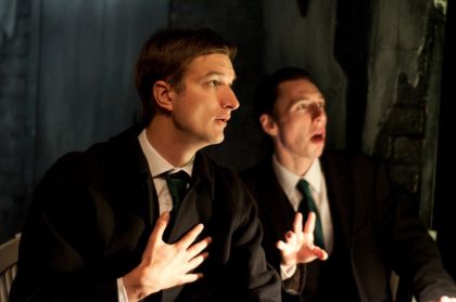 Two bureaucrats discuss the potential suicide of a man standing perfectly still in front of a door that opens into the night sky and a fatal drop.