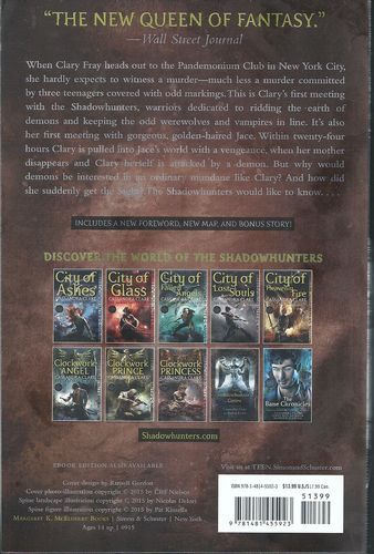 Discover the world of the Shadowhunters in the first installment of the internationally bestselling Mortal Instruments series and “prepare to be hooked” (Entertainment Weekly)—now with a gorgeous new cover, a map, a new foreword, and exclusive bonus content! City of Bones is a Shadowhunters novel.When fifteen-year-old Clary Fray heads out to the Pandemonium Club in New York City, she hardly expects to witness a murder—much less a murder committed by three teenagers covered with strange tattoos and brandishing bizarre weapons. And she’s more than a little startled when the body disappears into thin air. Soon Clary is introduced to the world of the Shadowhunters, a secret cadre of warriors dedicated to driving demons out of our world and back to their own. And Clary is introduced with a vengeance, when her mother disappears and Clary herself is almost killed by a grotesque monster. How could a mere human survive such an attack and kill a demon? The Shadowhunters would like to know…