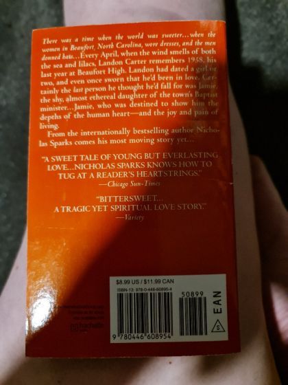 A high school rebel and a minister's daughter find strength in each other in this star-crossed tale of "young but everlasting love" (Chicago Sun-Times).There was a time when the world was sweeter....when the women in Beaufort, North Carolina, wore dresses, and the men donned hats.... Every April, when the wind smells of both the sea and lilacs, Landon Carter remembers 1958, his last year at Beaufort High. Landon had dated a girl or two, and even once sworn that he'd been in love. Certainly the last person he thought he'd fall for was Jamie, the shy, almost ethereal daughter of the town's Baptist minister....Jamie, who was destined to show him the depths of the human heart-and the joy and pain of living. The inspiration for this novel came from Nicholas Sparks's sister: her life and her courage. From the internationally bestselling author Nicholas Sparks, comes his most moving story yet....