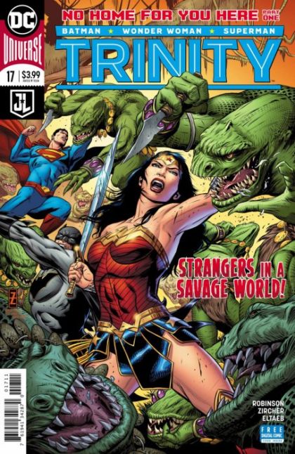 "No Home for you Here" part one! Batman and Superman embarked on a quest to help Wonder Woman rediscover Themyscira, but finding Diana's lost homeland proves more difficult than these three heroes expected. While on their journey, a distress call from a nearby ship turns out to be more than meets the eye, and the Trinity find themselves marooned on the dread island of Skartaris. To make their way back home, our heroes will have to overcome Deimos, who will stop at nothing to seal off Skartaris from the rest of world forever! RATED T