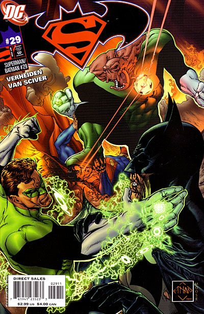 The shape-shifter continues to shadow and attack Batman and Superman, this time striking at Superman disguised as Lois Lane.As this is going on, some kind of energy or signal is managing to corrupt the power rings of Earth's Green Lanterns, and bend the Lanterns themselves to it's will. What's more, this seems to be connected to the shape-shifter. But what is the connection?