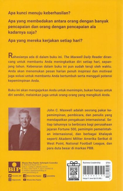 The Maxwell Daily Reader dirancang untuk membantu Anda meningkatkan diri setiap hari sepanjang tahun. Setiap halamannya memuat ringkasan dari salah satu buku Maxwell untuk menyemangati, mengajar, menantang, atau membantu Anda bertumbuh. Anda tidak akan dapat bertumbuh jika tidak mau berubah. Dan Anda tidak akan berubah, kecuali mengubah sesuatu dari apa yang Anda lakukan setiap hari. Buku ini akan mengajarkan Anda untuk memimpin, bukan hanya untuk diri sendiri, melainkan juga untuk orang-orang yang mengikuti Anda.