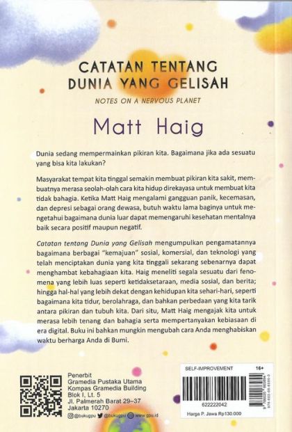 Catatan tentang Dunia yang Gelisah mengumpulkan pengamatannya bagaimana berbagai “kemajuan sosial, komersial, dan teknologi yang telah menciptakan dunia yang kita tinggali sekarang sebenarnya dapat menghambat kebahagiaan kita. Haig meneliti segala sesuatu dari fenomena yang lebih luas seperti ketidaksetaraan, media sosial, dan berita hingga hal-hal yang lebih dekat dengan kehidupan kita sehari-hari, seperti bagaimana kita tidur, berolahraga, dan bahkan perbedaan yang kita tarik antara pikiran dan tubuh kita. Dari situ. Matt Haig mengajak kita untuk merasa lebih tenang dan bahagia serta mempertanyakan kebiasaan di era digital. Buku ni bahkan mungkin mengubah cara Anda menghabiskan waktu berharga Anda di Bumi.