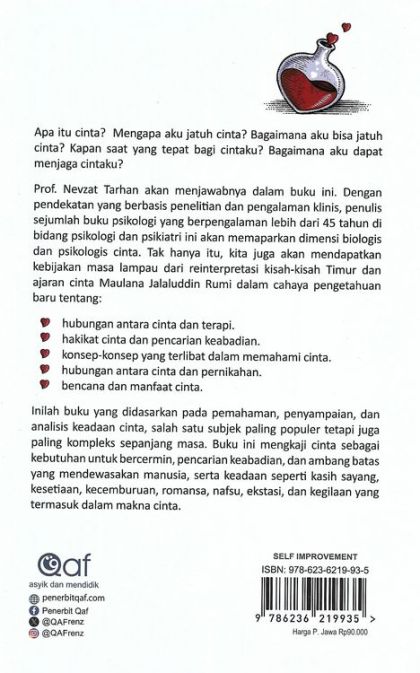 Prof. Nevzat Tarhan akan menjawabnya dalam buku ini. Dengan pendekatan yang berbasis penelitian dan pengalaman klinis, penulis sejumlah buku psikologi yang berpengalaman lebih dari 45 tahun di bidang psikologi dan psikiatri ini akan memaparkan dimensi biologis dan psikologis cinta. Tak hanya itu, kita juga akan mendapatkan kebijakan masa lampau dari reinterpretasi kisah-kisah Timur dan ajaran cinta Maulana Jalaluddin Rumi dalam cahaya pengetahuan baru tentang: