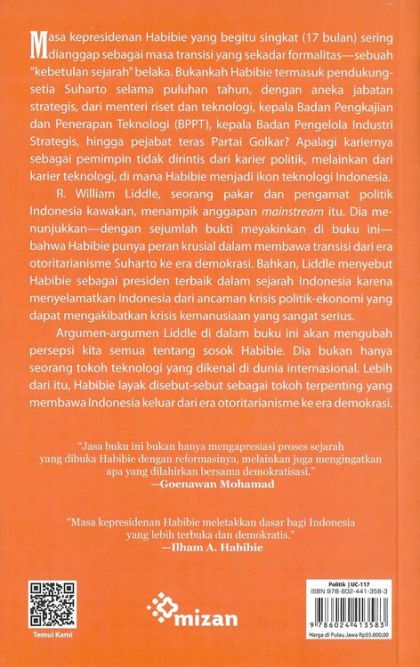 R. William Liddle, seorang pakar dan pengamat politik Indonesia kawakan, menampik anggapan mainstream itu. Dia menunjukkan—dengan sejumlah bukti meyakinkan di buku ini—bahwa Habibie punya peran krusial dalam membawa transisi dari era otoritarianisme Suharto ke era demokrasi. Bahkan, Liddle menyebut Habibie sebagai presiden terbaik dalam sejarah Indonesia karena menyelamatkan Indonesia dari ancaman krisis politik-ekonomi yang dapat mengakibatkan krisis kemanusiaan yang sangat serius.