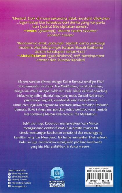 Marcus Aurelius dikenal sebagai Kaisar Romawi sekaligus filsuf Stoa termasyhur di dunia. The Meditations, jurnal pribadinya, hingga kini masih menjadi salah satu buku klasik spiritual penolong hidup yang paling dicintai sepanjang masa. Donald Robertson, psikoterapis kognitif, membedah kisah hidup Marcus untuk menunjukkan bagaimana ketertarikannya terhadap Stoik bermula. Buku ini juga mengungkap setiap peristiwa yang menjadi latar belakang Marcus kala menulis The Meditations.