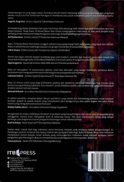 Seolah tidak masuk akal bagi Indonesia untuk bersaing menjadi yang terdepan dalam pengembangan Al. Pandangan pesimis ini benar bila hanya mellhat dari perspektif teknologi, Buku19 Naras Besar Akal Imitasi ini menjelaskan bahwa banyak narasi terbuka yang memungkinkan Indonesia untuk menjadi terdepan dalam pengembangan teknologi Al. Buku ini menjadi bacaan wajib bagi para mahasiswa dan akademis.
