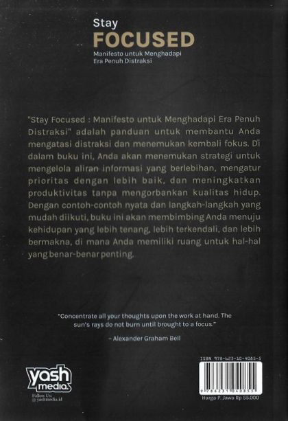 Stay Focused : Manifesto untuk Menghadapi Era Penuh Distraksi" adalah panduan untuk membantu Anda mengatasi distraksi dan menemukan kembali fokus. Di dalam buku ini, Anda akan menemukan strategi untuk mengelola aliran informasi yang berlebihan, mengatur prioritas dengan lebih baik, dan meningkatkan produktivitas tanpa mengorbankan kualitas hidup. Dengan contoh-contoh nyata dan langkah-langkah yang mudah diikuti, buku ini akan membimbing Anda menuju kehidupan yang lebih tenang, lebih terkendali, dan lebih bermakna, di mana Anda memiliki ruang untuk hal-hal yang benar-benar penting.