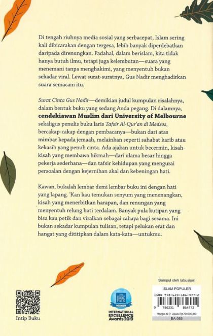 Surat Cinta Gus Nadir—begitulah kumpulan surat ini dinamai dalam buku yang tengah Anda genggam. Di dalamnya, cendekiawan Muslim dari University of Melbourne sekaligus penulis buku laris Tafsir al-Qur’an di Medsos, bercakap-cakap dengan pembacanya—bukan dari atas mimbar kepada jamaah, melainkan seperti sahabat karib atau kekasih yang penuh kasih. Ada ajakan untuk bercermin, kisah-kisah yang membawa hikmah—dari ulama besar hingga pekerja sederhana—dan tafsir kehidupan yang mengurai persoalan dengan kejernihan akal dan kebeningan hati.