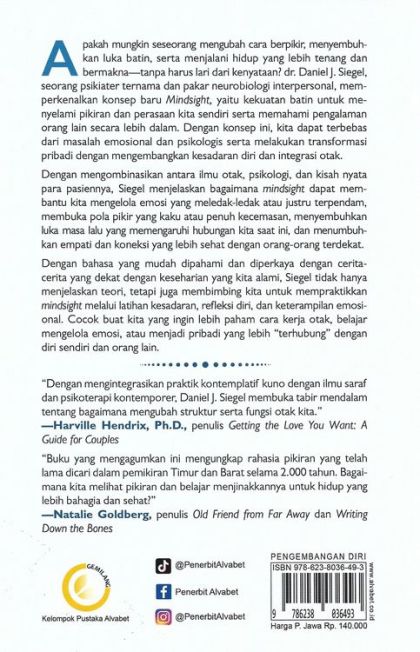 dr. Daniel J. Siegel, seorang psikiater ternama dan pakar neurobiologi interpersonal, memperkenalkan konsep baru Mindsight, yaitu kekuatan batin untuk menyelami pikiran dan perasaan kita sendiri serta memahami pengalaman orang lain secara lebih dalam. Dengan konsep ini, kita dapat terbebas dari masalah emosional dan psikologis serta melakukan transformasi pribadi dengan mengembangkan kesadaran diri dan integrasi otak.