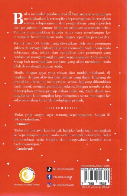Terdiri dari 100 habits yang diterapkan oleh para pemimpin sukses di berbagai bidang. Buku ini memandu Anda menjelajahi kebiasaan, alat, teknik, dan mentalitas para pemimpin yang cerdas dan mengembangkan gaya kepemimpinan Anda sendiri. Setiap bab menampilkan ide baru yang akan membantu Anda lebih dekat dengan tujuan Anda.