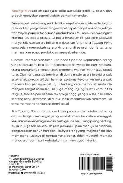 Sama seperti satu orang sakit dapat menyebabkan epidemi flu, begitu pula sentilan yang disasar dengan tepat dapat menyebabkan terjadinya tren fesyen, popularitas sebuah produk baru, atau menurunnya tingkat kriminalitas secara drastis. Di buku bestseller ini, Malcolm Gladwell menyelidiki dan secara brilian menjelaskan fenomena Tipping Point yang telah mengubah cara pikir orang di seluruh dunia tentang memasarkan suatu produk dan menyebarkan ide.