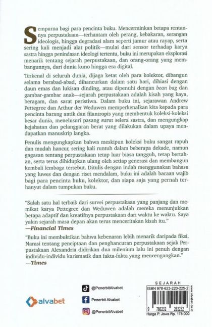 Terkenal di seluruh dunia, dijaga ketat oleh para kolektor, dibangun selama berabad-abad, dihancurkan dalam satu hari, dihiasi dengan daun emas dan lukisan dinding, atau dipenuhi dengan bean bag dan gambar-gambar anak—sejarah perpustakaan adalah kisah yang kaya, beragam, dan sarat peristiwa. Dalam buku ini, sejarawan Andrew Pettegree dan Arthur der Weduwen memperkenalkan kita kepada para pencinta barang antik dan filantropis yang membentuk koleksi-koleksi besar dunia, menelusuri pasang surut selera sastra, dan mengungkap kejahatan dan pelanggaran berat yang dilakukan dalam upaya mendapatkan manuskrip langka.