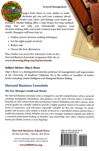 The New Manager’s Guide and Mentor The Harvard Business Essentials series is designed to provide comprehensive advice, personal coaching, background information, and guidance on the most relevant topics in business. Whether you are a new manager seeking to expand your skills or a seasoned professional looking to broaden your knowledge base, these solution-oriented books put reliable answers at your fingertips. Decision making is a critical part of management, and bad choices can damage careers and the bottom line. This book offers the tools and advice managers need to avoid common biases and arrive at and implement decisions that are both sound and ethical.