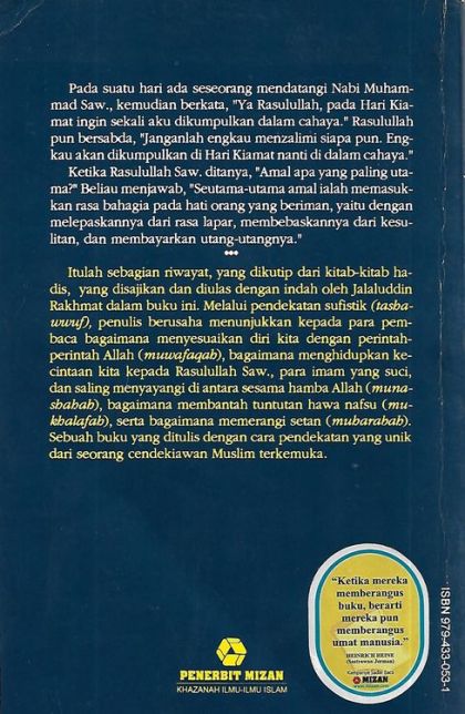 Itulah sebagian riwayat, yang dikutip dari kitab-kitab hadis, yang disajikan dan diulas dengan indah oleh Jalaluddin Rakhmat dalam buku ini. Melalui pendekatan sufistik (tashawwuf), penulis berusaha menunjukkan kepada para pembaca bagaimana menyesuaikan diri kita dengan perintah-perintah Allah (muwafaqah), bagaimana menghidupkan kecintaan kita kepada Rasulullah Saw., para imam yang suci, dan saling menyayangi di antara sesama hamba Allah (munashahah), bagaimana membantah tuntutan hawa nafsu (mukhalafah), serta bagaimana memerangi setan (muharabah). Sebuah buku yang ditulis dengan cara pendekatan yang unik dari seorang cendekiawan Muslim terkemuka