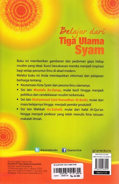 Buku ini memberikan gambaran dan pedoman gaya hidup muslim yang ideal. Kunci kesuksesan mereka menjadi inspirasi bagi setiap penuntut ilmu di abad modern. Melalui buku ini Anda mendapatkan informasi dan pelajaran berharga tentang: å¥ Keutamaan Kota Syam dan pesona ilmu ulamanya. å¥ Sisi lain Mustafa Az-Zarqa, mulai kecil hingga menjadi politikus dan cendekiawan muslim terkemuka. å¥ Sisi lain Muhammad Said Ramadhan Al-Buthi, mulai dari masa belajarnya hingga menjadi pemikir produktif. å¥ Sisi lain Wahbah Az-Zuhaili, mulai dari hafal Al-QuråÕan hingga menjadi profesor yang telah menulis lima ratusan makalah ilmiah.