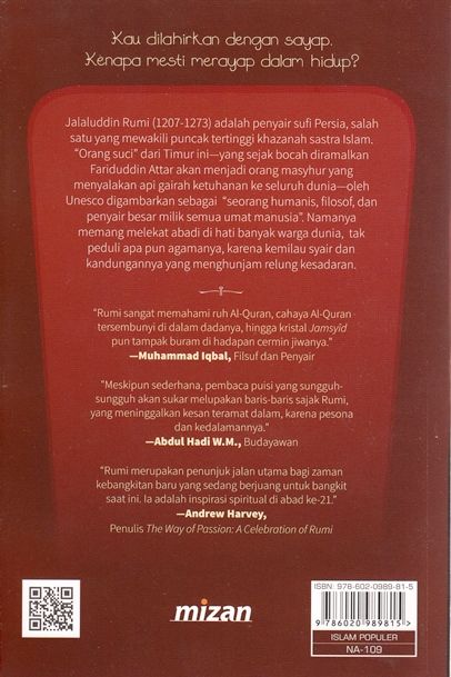 Jalaluddin Rumi (1207-1273) adalah penyair sufi Persia, salah satu yang mewakili puncak tertinggi khazanah sastra Islam. "Orang suci" dari Timur ini-yang sejak bocah diramalkan oleh Fariduddin Attar akan menjadi orang masyhur yang akan menyalakan api gairah ketuhanan ke seluruh dunia-oleh Unesco digambarkan sebagai "seorang humanis, filosof, dan penyair besar milik semua umat manusia". Namanya memang melekat abadi di hati banyak warga dunia, tak peduali apa pun agamanya, karena kemilau syair dan kandungannya yang menghunjam relung kesadaran."Rumi sangat memahami ruh Al-Quran, cahaya Al-Quran tersembunyi di dalam dadanya, hingga kristal Jamsyîd pun tampal buram di hadapan cermin jiwanya." --Muhammad Iqbal, Filsuf dan Penyair"Meskipun sederhana, pembaca puisi yang sungguh-sungguh akan sukar melupakan baris-baris sajak Rumi, yang meninggalkan kesan teramat dalam, karena pesona dan kedalamannya." --Abdul Hadi W.M. , Budayawan"Rumi merupakan penunjuk jalan utama bagi zaman kebangkitan baru yang sedang berjuang untuk bangkit saat ini. Ia adalah inspirasi spiritusl di abad ke-21." --Andrew Harvey, Penulis The Way of Passion A Celebration of Rumi[Mizan, Noura Books, Rumi, Puisi, Sajak, Agama, Islam, Sufi, Indonesia]