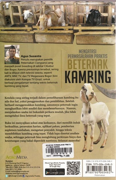 Kendala Yang Sering Terjadi Dalam Pemeliharaan Kambing Itu Ada Dua Hal, Yakni Penggemukan Dan Pembibitan. Setelah Berhasil Menggemukkan Kambing, Umumnya Peternak Ingin Menghasilkan Bibit Sendiri Dan Membesarkannya. Namun, Menjalankan Usaha Ini Bukanlah Perkara Mudah, Jika Tidak Mengetahui Ilmu Beternak Yang Tepat. Buku Ini Menyajikan Solusi Atas Keduanya, Dari Memilih Induk Berkualitas, Perawatan Harian, Aplikasi Pakan, Pemberian Suplemen Tambahan, Mengatasi Penyakit, Hingga Teknis Membibitkan Kambing Yang Tepat. Tidak Lupa Disertai Analisis Usaha, Sehingga Peternak Bisa Menghitung Perkiraan Biaya Dan Keuntungan Yang Bakal Diperoleh Nantinya. Selamat Mencoba! Buku Persembahan Dari Penerbit Agromedia Pustaka Ini Mengatasi Permasalahan Praktis Beternak Kambing Paling Update, Dari Pembibitan Hingga Penggemukan. Kambing, Bisnis Kambing, Peluang Bisnis, Prospek Bisnis, Pembibitan Kambing, Pembesaran Kambing, Penggemukan Domba, Bobot Domba, Alternatif Kambing Potong, Bisnis Kambing Potong, Pakan Kambing, Hijauan, Konsentrat, Perkandangan Kambing, Manajemen Kandang, Manajemen Pakan, Meracik Pakan, Mengatasi Penyakit Kambing.
