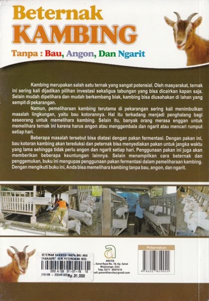 Kambign merupakan salah satu ternak yang sangat potensial. Oleh masyarakat, ternak ini sering kali dijadikan pilihan investasi sekaligus tabungan yang bisa dicairkan kapan saja. Selain mudah dipelihara dan mudah berkembang biak, kambing bisa diusahakan di lahan yang sempit di pekarangan. Namun, pemeliharaan kambing terutama di pekarangan sering kali menimbulkan masalah lignkungan, yaiut bau kotorannya. Hal itu terkadang menjadi penghalang bagi seseorang untuk memelihara kambing. Selain itu, banyak orang merasa enggan untuk memelihara ternak ini karena harus angon atau menggembala dan ngarit atau mencari rumput setiap hari. Beberapa masalah tersebut bisa diatasi dengan pakan fermentasi. Dengan pakan ini, bau kotoran kambing akan tereduksi dan peternak bia menyediakan pakan untuk jangka waktu yang lama sehingga tidak perlu angon dan ngarit setiap hari. Penggunaan pakan ini juga akan memberikan beberapa keuntungan lainnya. Selain menampilkan cara beternaik dan penggemukan, buku ini mengupas penggunaan pakan fermentasi dalam pemelihraan kambing. Dengan mengikuti buku ini, Anda bisa memelihara kambing tanpa bau, angon, dan ngarit.