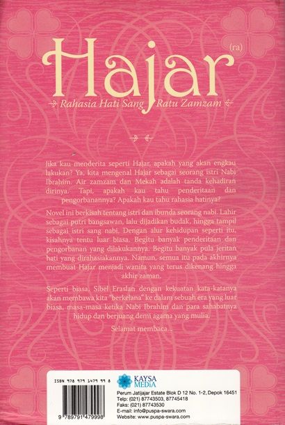 Jika kau menderita seperti Hajar, apakah yang akan engkau lakukan? Ya, kita mengenal Hajar sebagai seorang istri Nabi Ibrahim. Air zamzam dan Mekah adalah tanda kehadiran dirinya. Tapi, apakah kau tahu penderitaan dan pengorbanannya? Apakah kau tahu rahasia hatinya?Novel ini berkisah tentang istri dan ibunda seorang nabi. Lahir sebagai putri bangsawan, lalu dijadikan budak, hingga tampil sebagai istri sang nabi. Dengan alur kehidupan seperti itu, kisahnya tentu luar biasa. Begitu banyak penderitaan dan pengorbanan yang dilakukannya. Begitu banyak pula jeritan hati yang dirasakannya. Namun, semua itu pada akhirnya membuat Hajar menjadi wanita yang terus dikenang hingga akhir zaman.Seperti biasa, Sibel Eraslan dengan kekuatan kata-katanya akan membawa kita “berkelana” ke dalam sebuah era yang luar biasa, masa-masa keitka Nabi Ibrahim dan para sahabatnya hidup dan berjuang demi agama yang mulia.Selamat membaca…