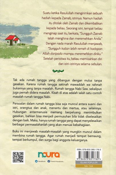 Suatu ketika Rasulullah mengirimkan sebuah hadiah kepada Zainab, istrinya. Namun hadiah itu ditolak oleh Zainab dan dikembalikan kepada beliau. Seorang istri, tempat beliau menginap saat itu, berkata, "Sungguh Zainab telah menghina dan meremehkan Anda." Dengan nada marah Rasulullah menjawab, "Sungguh kalian lebih remeh di hadapan Allah daripada mampu meremehkan diriku."Setelah peristiwa itu beliau memisahkan diri dari istri-istrinya selama sebulan.Tak ada rumah tangga yang dibangun dengan mulus tanpa gesekan. Karena rumah tangga sakinah mawaddah wa rahmah bukannya yang tanpa masalah. Rumah tangga Nabi Saw. sekalipun juga pernah didera masalah. Kisah di atas adalah salah satu contoh masalah rumah tangga Nabi. Persoalan dalam rumah tangga bisa saja muncul antara suami dan istri, orangtua dan anak, menantu dan mertua, atau selainnya. Hubungan antarmanusia memang berpeluang menimbulkan gesekan, bahkan bisa menjadi permusuhan bila tidak diselesaikan dengan baik. Maka, hanya rumah tangga yang dapat menyelesaikan berbagai permasalahanlah yang akan menuai kebahagiaan. Buku ini menjawab masalah-masalah yang mungkin muncul dalam membina rumah tangga. Agar rumah menjadi tempat bernaung, tempat berkumpul, dan surga bagi anggota keluarganya.[Mizan, Noura Books, Nourabooks, Islam, Keluarga, Muda, Indonesia]