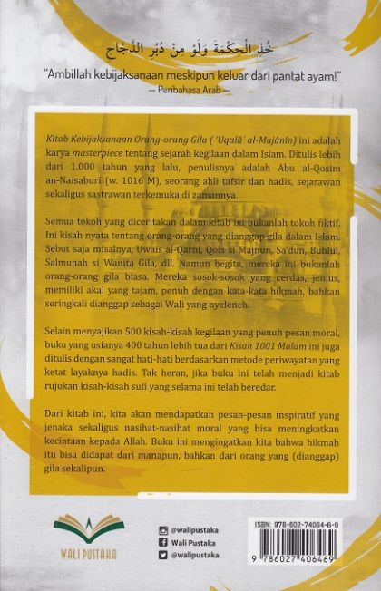 Deskripsi Produk Kitab Kebijaksanaan Orang-orang Gila (Uqala` al-Majanin) ini adalah karya masterpiece tentang sejarah kegilaan dalam Islam. Ditulis lebih dari 1.000 tahun yang lalu, penulisnya adalah Abu al-Qosim an-Naisaburi (w. 1016 M), seorang ahli tafsir dan hadis, sejarawan sekaligus sastrawanterkemuka di tokoh yang diceritakan dalam kitab ini bukanlah tokoh fiktif. Ini kisah nyata tentang orang-orang yang dianggap gila dalam Islam. Sebut saja misalnya, Uwais al-Qarni, Qois si Majnun, Sadun, Buhlul, Salmunah si Wanita Gila, dll. Namun begitu, mereka ini bukanlah orang- orang gila biasa. Mereka sosok-sosok yang cerdas, jenius, memiliki akal yang tajam, penuh dengan kata-kata hikmah, bahkan seringkali dianggap sebagai Wali yang nyeleneh. Selain menyajikan 500 kisah-kisah kegilaan yang penuh pesan moral, buku yang usianya 400 tahun lebih tua dari Kisah 1001 Malam ini juga ditulis dengan sangat hati-hati berdasarkan metode periwayatan yang ketat layaknya hadis. Tak heran, jika buku ini telah menjadi kitab rujukan kisah-kisah sufi yang selama ini telah beredar. Semua kisah tentang sufi adalah hal-hal yang lebih sering tak bisa dijelaskan dengan logika manusia, mungkin itu yang disebut karomah. Dari kitab ini, kita akan mendapatkan pesan-pesan inspiratif yang jenaka sekaligus nasihat-nasihat moral yang bisa meningkatkan kecintaan kepada Allah. Buku ini mengingatkan kita bahwa hikmah itu bisa didapat dari manapun, bahkan dari orang yang (dianggap) gila sekalipun.