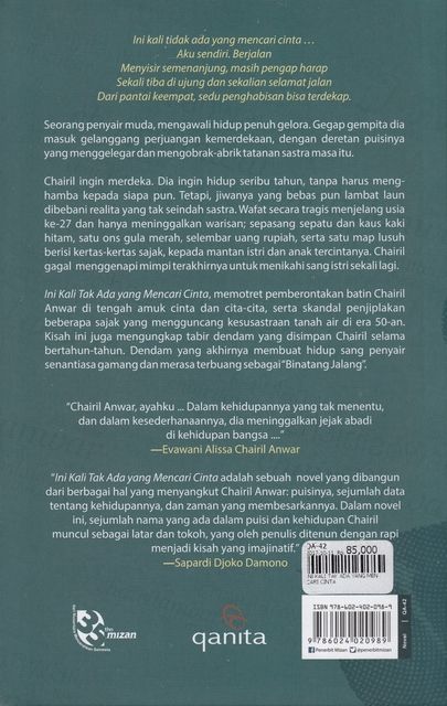 Ini kali tidak ada yang mencari cinta... Aku sendiri. Berjalan Menyisir semenanjung, masih pengap harap Sekali tiba di ujung dan sekalian selamat jalan Dari pantai ke empat, sedu penghabisan bisa terdekap Dia penyair muda, yang mengawali hidup dengan penuh gelora. Gegap gempita dia masuk ke gelanggang perjuangan kemerdekaan. Dengan deretan puisinya yang menggelegar dan mengobrak-abrik tatanan sastra masa itu. Chairil ingin merdeka, dia ingin hidup seribu tahun, tanpa harus menghamba pada siapa pun. Tetapi, jiwanya yang bebas pun lambat laun dibebani realita yang tak seindah sastra. Dan saat hati tercabik antara cinta dan cita-cita, Chairil harus mengambil pilihan pahit. Demi seni, demi puisi, demi hidup. Novel ini mengisahkan hidup dan puisi Chairil Anwar, salah satu pendiri Angkatan 45, yang meski masa hidupnya sangat singkat namun gema semangatnya masih terasa hingga kini. Lewat karya-karyanya yang monumental, Chairil hingga sekarang masih mampu menggetarkan hati para pembacanya. Hati yang memberontak mendambakan kebebasan dan keabadian.[Mizan, Qanita, Biografi, Kisah Hidup, Chairil Anwar, Pembrontakan, Revolusi, Kemerdekaan, Seni, Puisi, Dewasa, Indonesia]