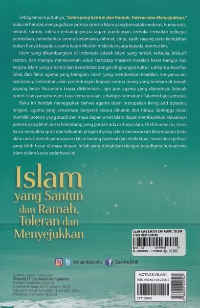 Sinopsis: Sebagaimana judulnya, “Islam yang Santun dan Ramah, Toleran dan Menyejukkan,” buku ini hendak menyuguhkan prinsip-prinsip Islam yang berwatak moderat, humanistik, inklusif, santun, toleran terhadap puspa ragam pandangan, terbuka terhadap pelbagai perbedaan, menebarkan aroma kedamaian, rahmat, cinta, kasih sayang serta keindahan bukan hanya kepada sesama kaum Muslim melainkan juga kepada non-Muslim. Islam yang dikembangkan di Indonesia adalah Islam yang ramah, terbuka, inklusif, santun, dan mampu menawarkan solusi terhadap masalah-masalah besar bangsa dan negara. Islam yang dinamis dan bersahabat dengan lingkungan kultur, sub-kultur, kearifan lokal, dan fakta agama yang beragam. Islam yang memberikan keadilan, kenyamanan, keamanan, keteduhan, dan perlindungan kepada semua orang yang berdiam di bawah payung besar Nusantara tanpa diskriminasi, apapun agama yang dianutnya. Sebuah potret Islam yang humanis bagi kemanusiaan, sekaligus rahmatan lil ‘alamin bagi semesta. Buku ini hendak menegaskan bahwa agama Islam merupakan Living and dynamic religion, agama yang senantiasa bergerak secara dinamis dan hidup; Sehingga Islam memiliki potensi yang abadi dan masa depan umat Islam dapat membuahkan aktualisasi potensi yang lebih besar ketimbang yang pernah ada di masa silam. Oleh karena itu, Islam harus menjelma menjadi spririt dan kekuatan progresif yang selalu menawarkan kesempatan tiada akhir untuk meraih pencapaian dalam bidang material dan intelektual, moral dan spiritual yang lebih besar di masa depan. Inilah yang diinginkan dengan paradigma humanisme Islam dalam karya sederhana ini.
